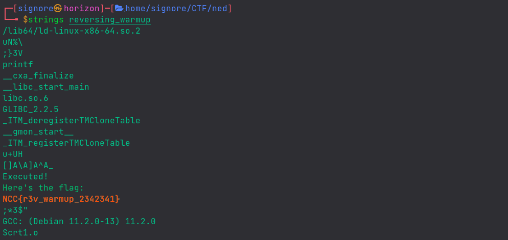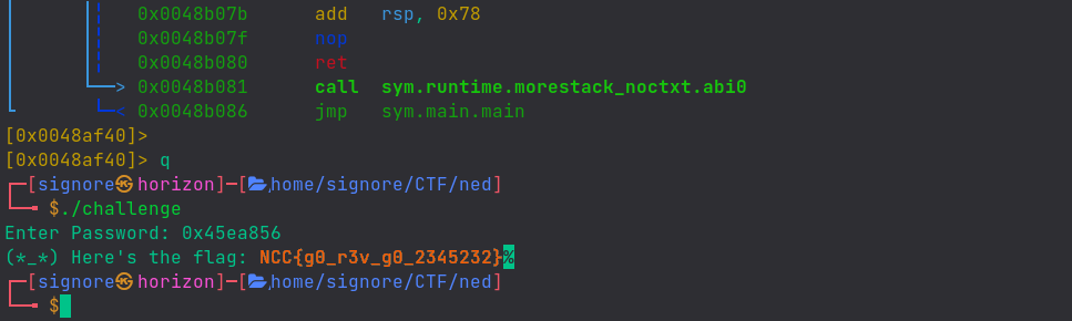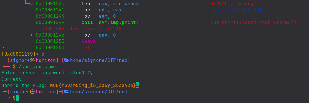 Upon opening the binary with rizin, we can see our flag right there but it’s scattered. We can also see another string which resembles a password.