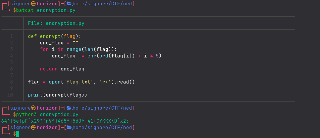 The script is taking input data as flag.txt. The encrypt function gets the unicode code of each character present in the file with ord() and adds some integers to it. Then, it converts the characters back to ASCII with chr().