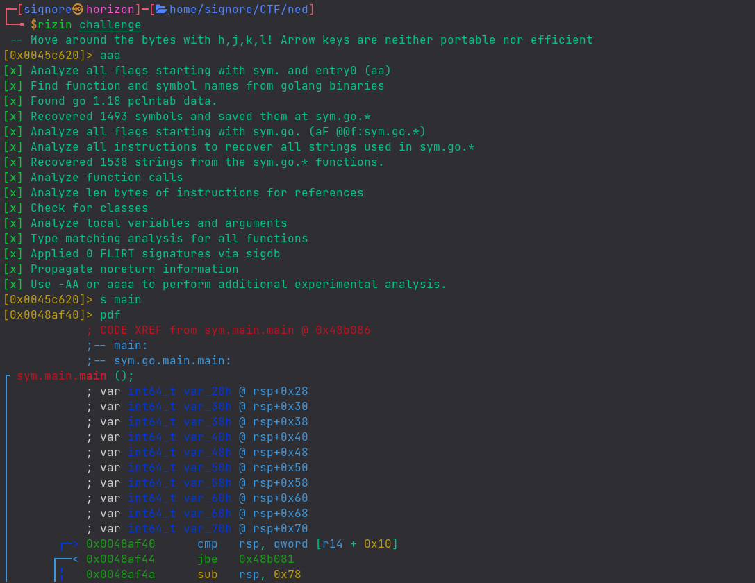 Opening the challenge file in rizin, we seek to main function and disassemble it.