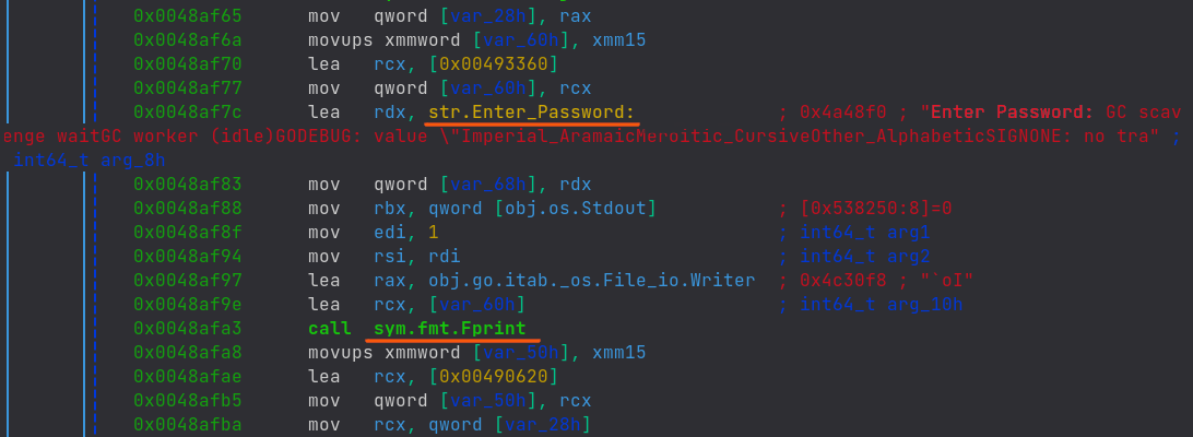 Going a bit down, we can see the Enter_Password string which is later being printed in the console with a call to Fprint: