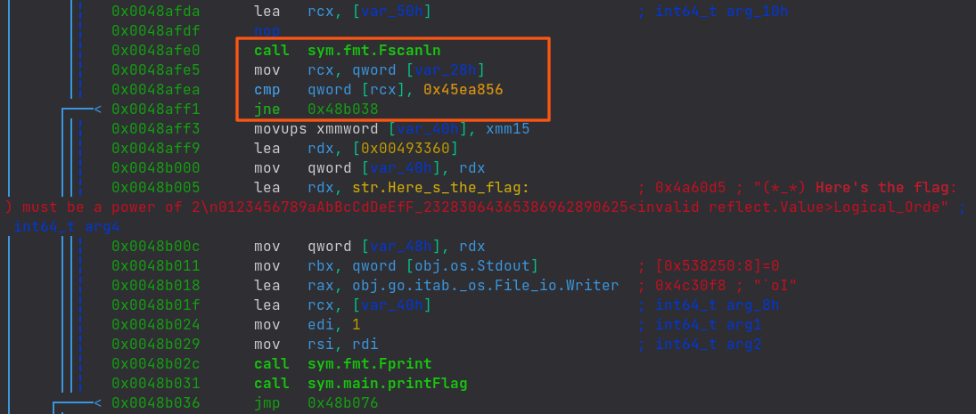 Going futher down, we see there is the call to Fscanln which is taking user input. In the next instructions, there’s a string comparison being made and then there is the jne (jump if not equal) instruction from which we can deduce that there’s a condition being checked.