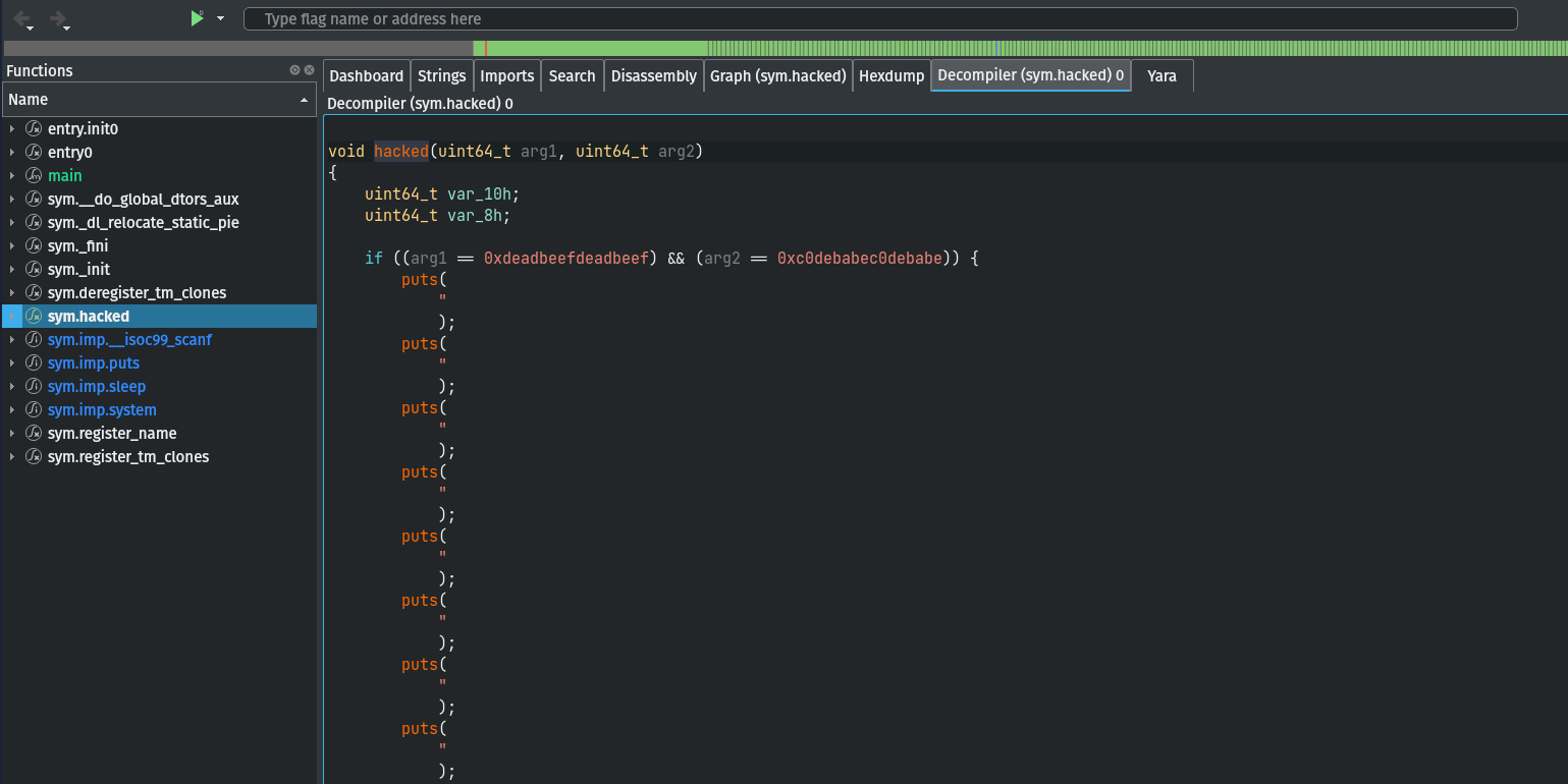 Along main and register_name functions, we can see another function hacked. In the decompiled code, we can see that an if condition is checking the function arguments. We can also see the values against which the params are being compared. Let’s keep note of these values.