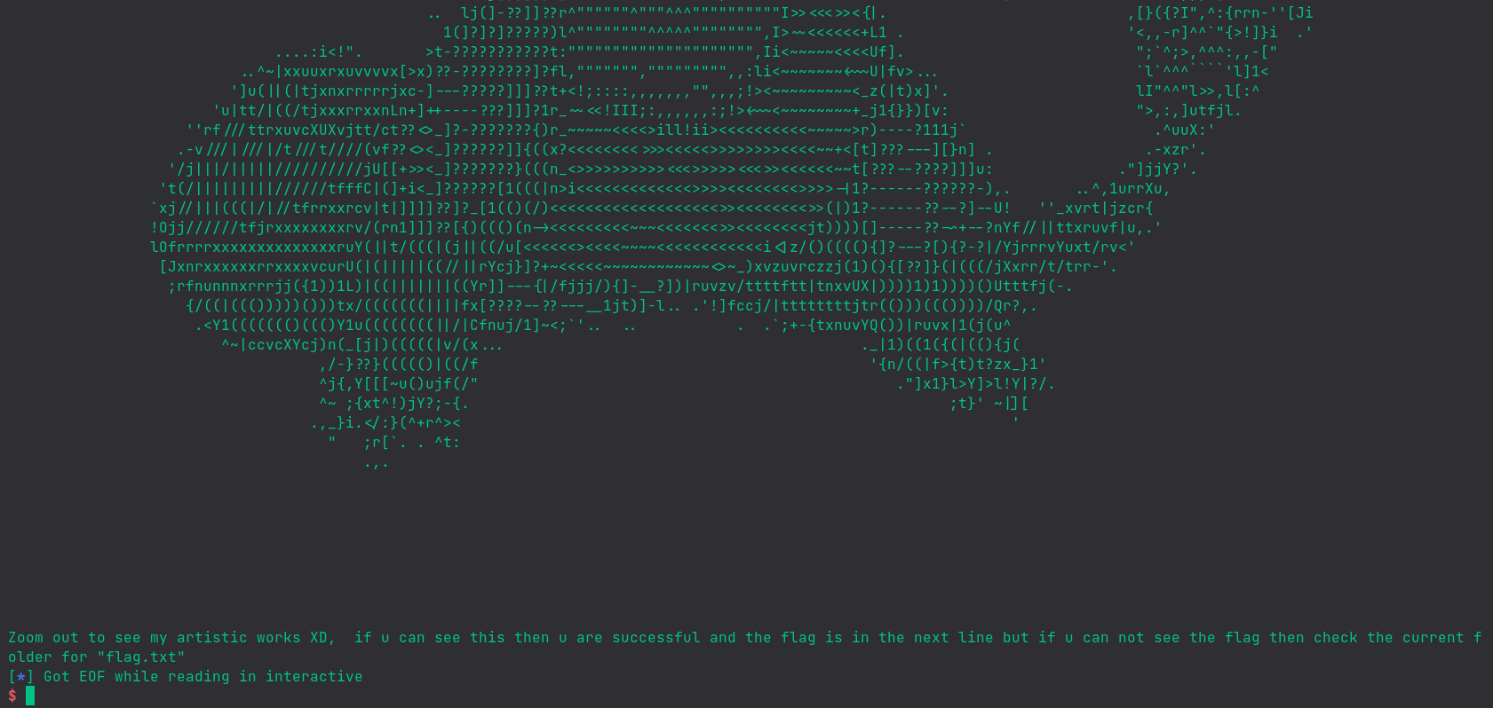 On running the exploit, we successfully execute hacked function and bypass the conditional check by providing right arguments which, along with the beautiful dragon, returns the contents of flag.txt.