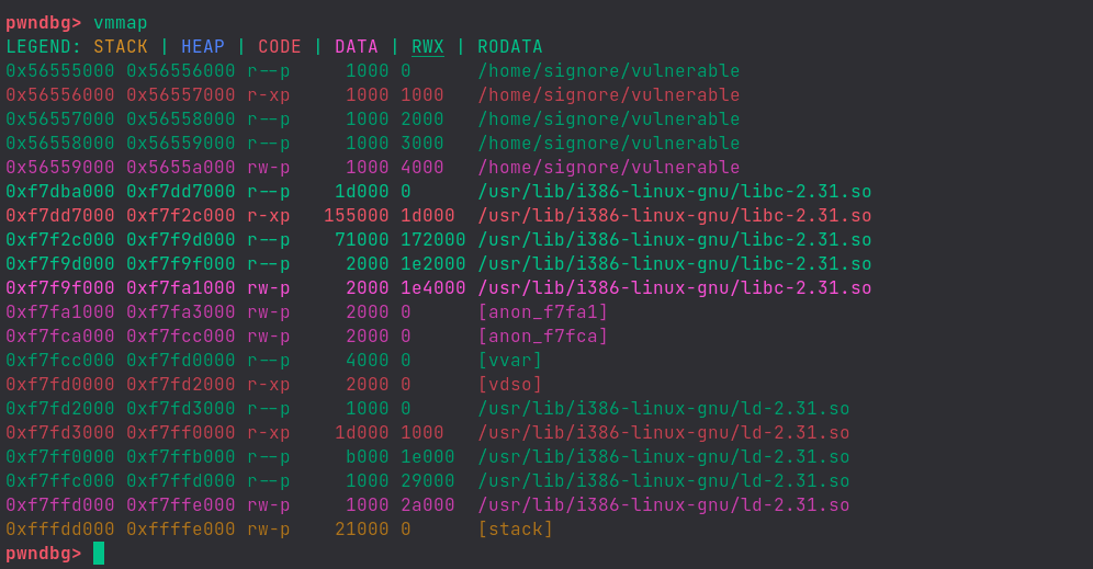 With the vmmap command in gdb, we can confirm that the libc/certain sections of libc are loaded into the program